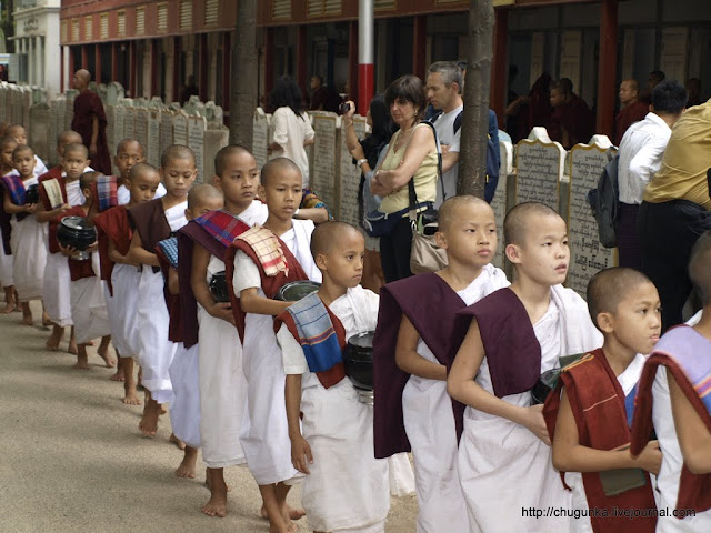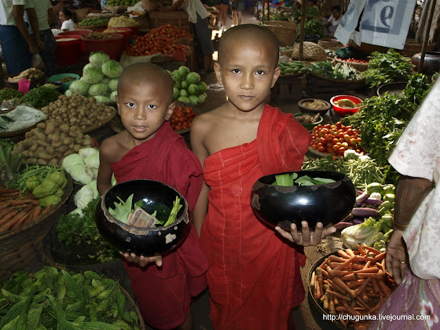 Монахи и послушники встают очень рано. Перекусив рисом, они берут по специальному сосуду для пожертвований, и отправляются в ближайший город или деревню собирать в них еду. Монахам разрешено принимать пищу только до 12 часов каждого дня, так что приходится крутиться быстро!